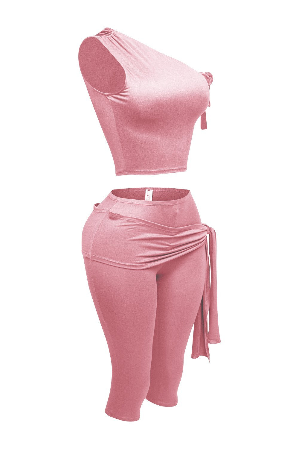 Effortlessly chic and comfortable, the Bella Capri Set features a one shoulder design with a tied arm sleeve for a touch of elegance. Made with stretchy fabric, this set includes capri leggings for added versatility and style. Elevate your wardrobe with this must-have set.