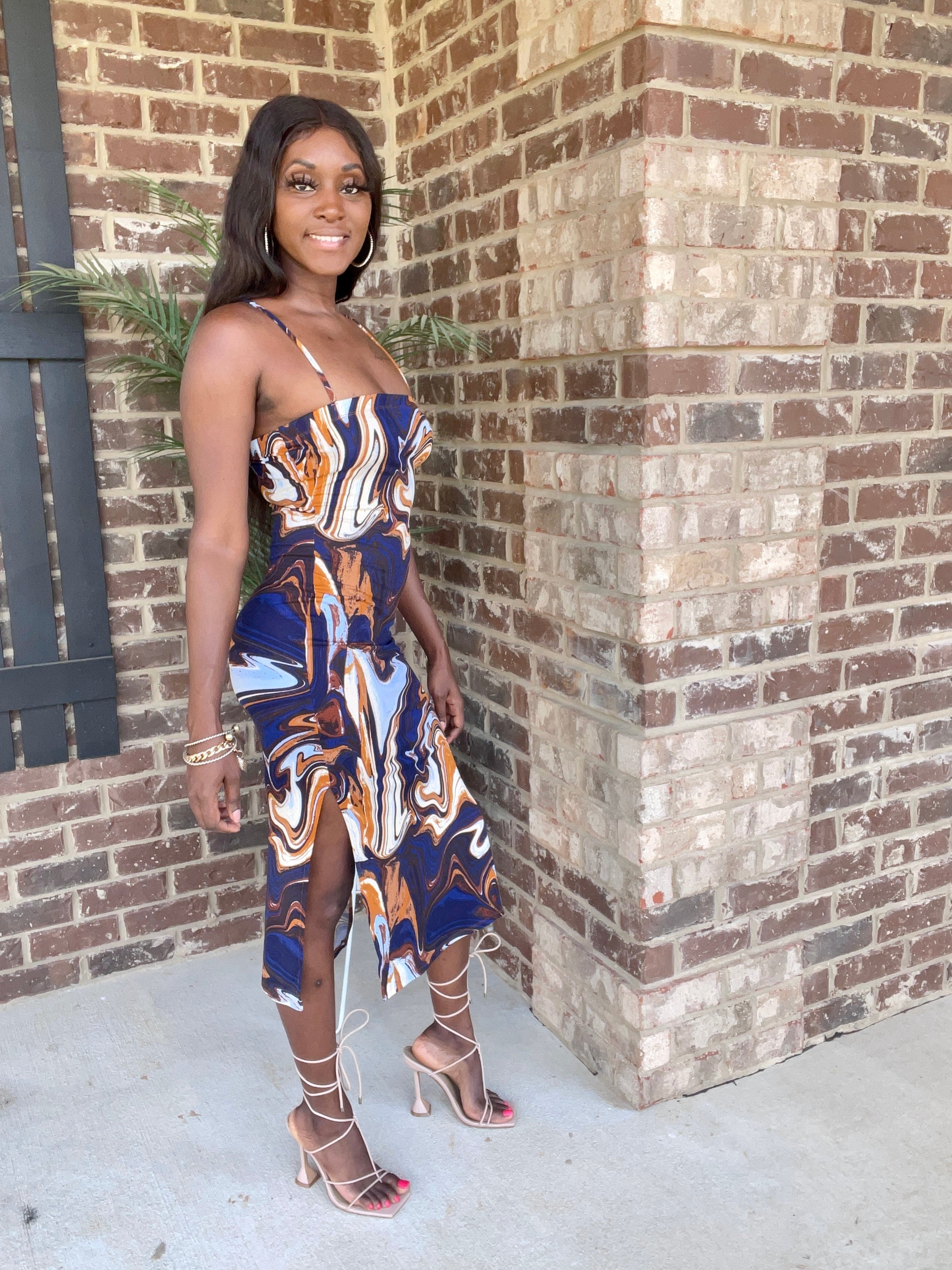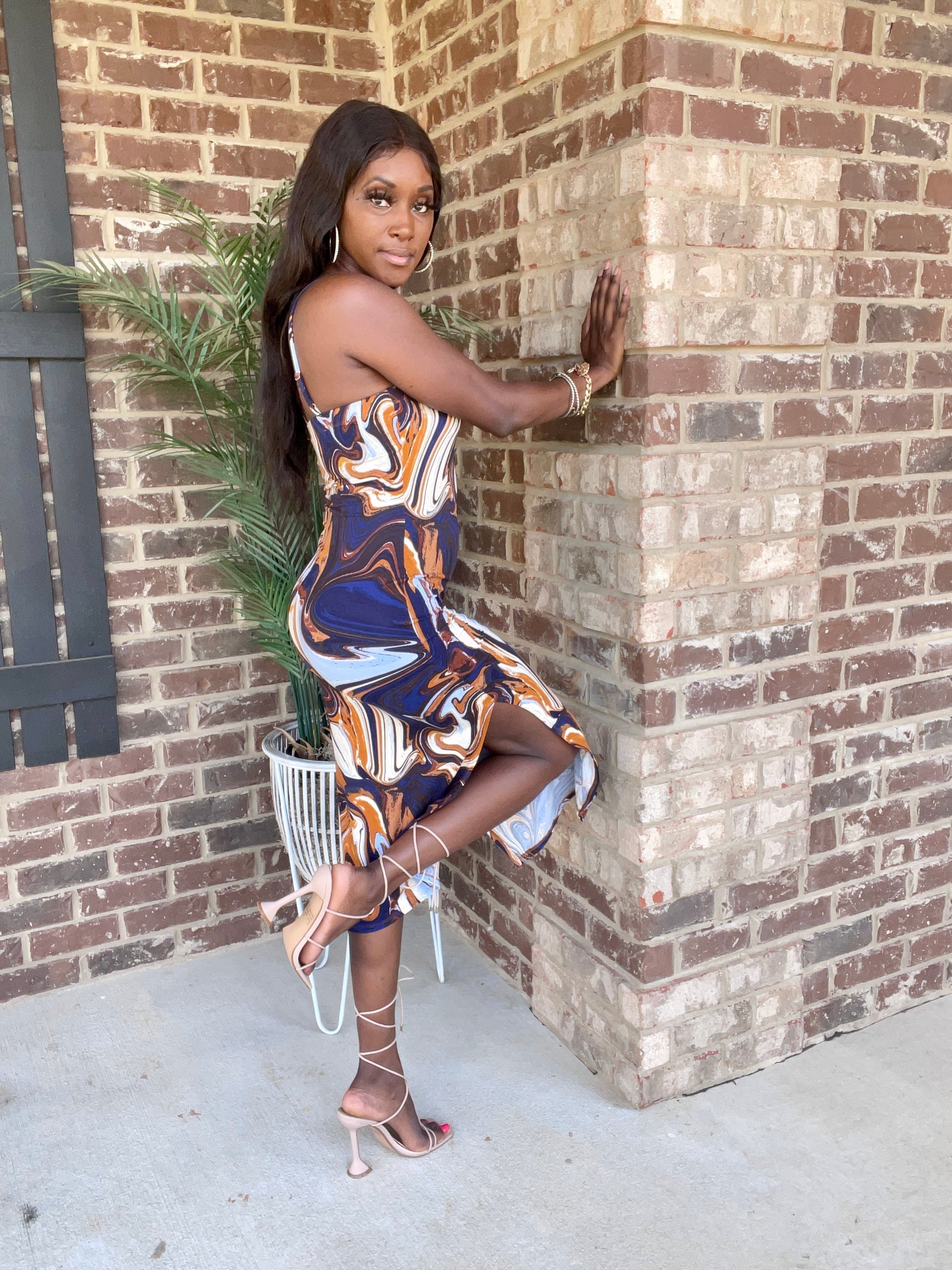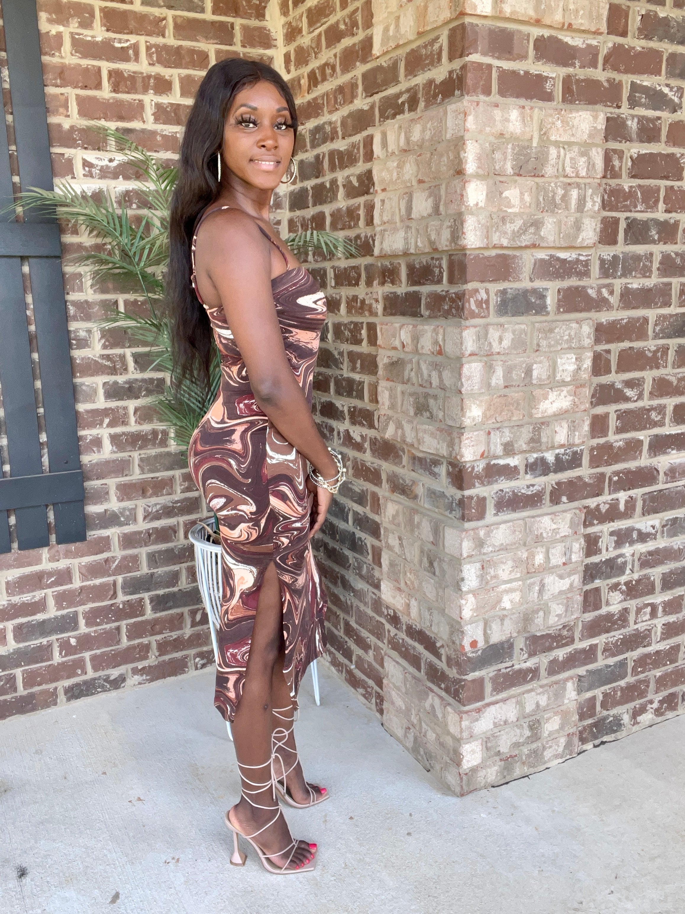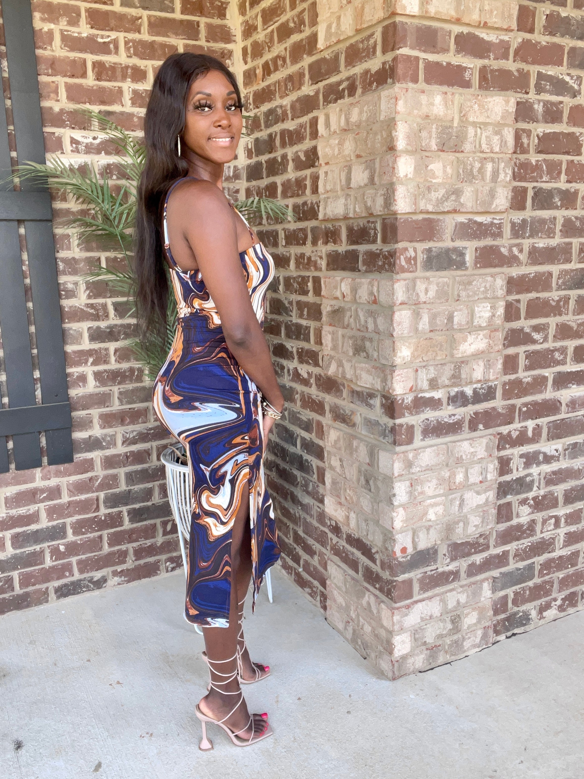 This Marble Midi Dress is crafted from a textured marble pattern fabric that's incredibly soft to the touch. Its midi length silhouette is finished with stunning side slits, making it a great choice for special occasions. Perfect for warm summer days or dressed up with accessories for a night out.
