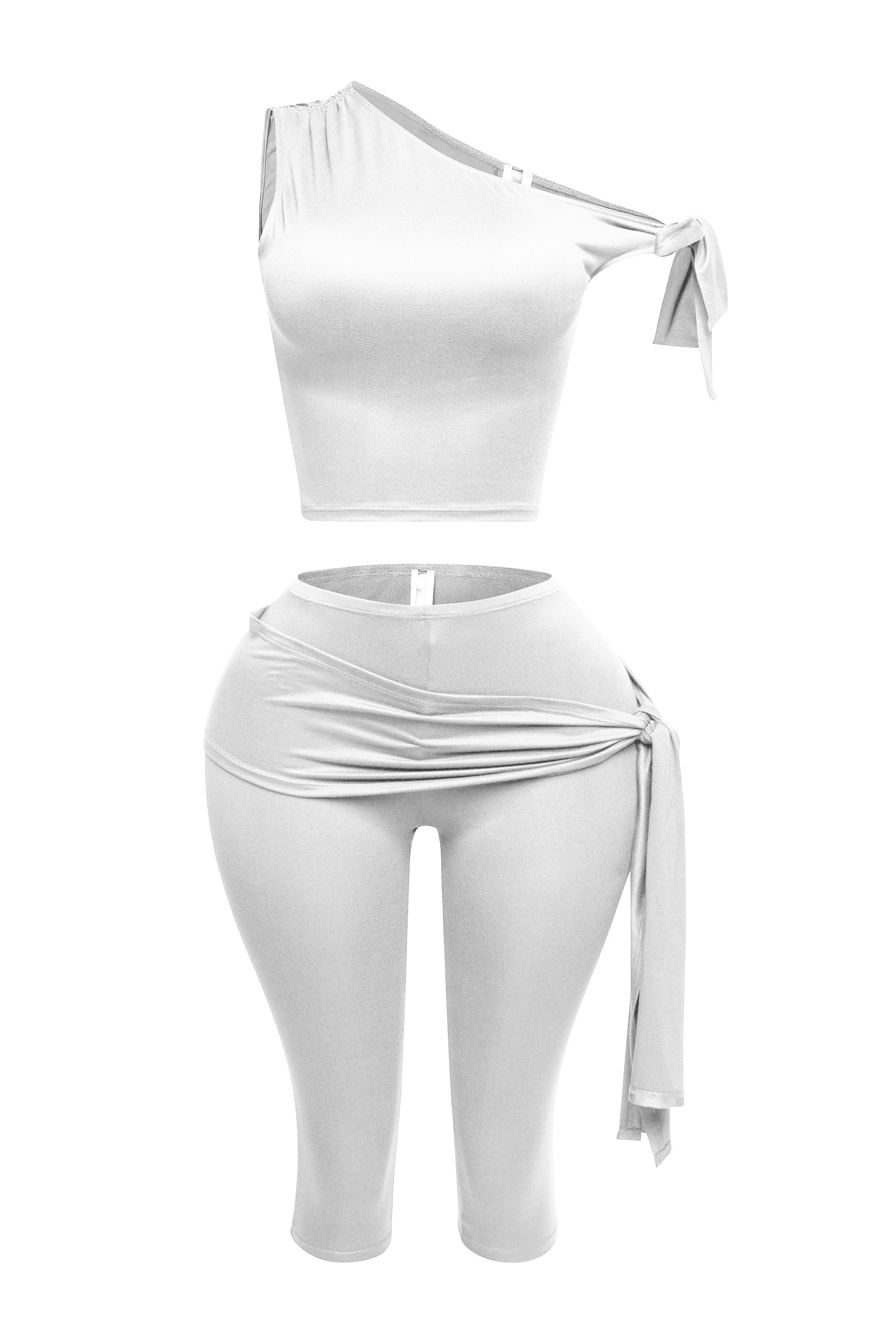Effortlessly chic and comfortable, the Bella Capri Set features a one shoulder design with a tied arm sleeve for a touch of elegance. Made with stretchy fabric, this set includes capri leggings for added versatility and style. Elevate your wardrobe with this must-have set.