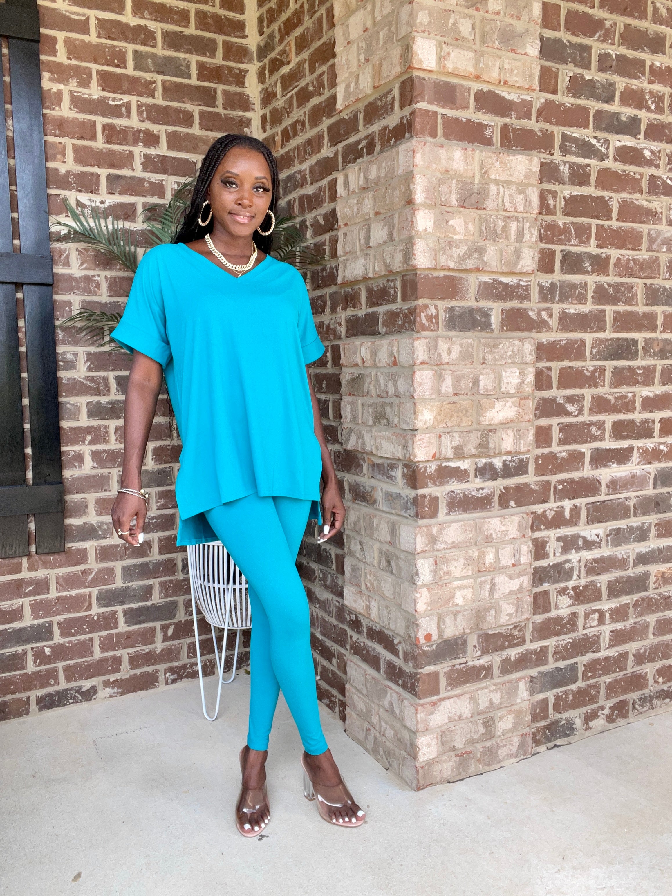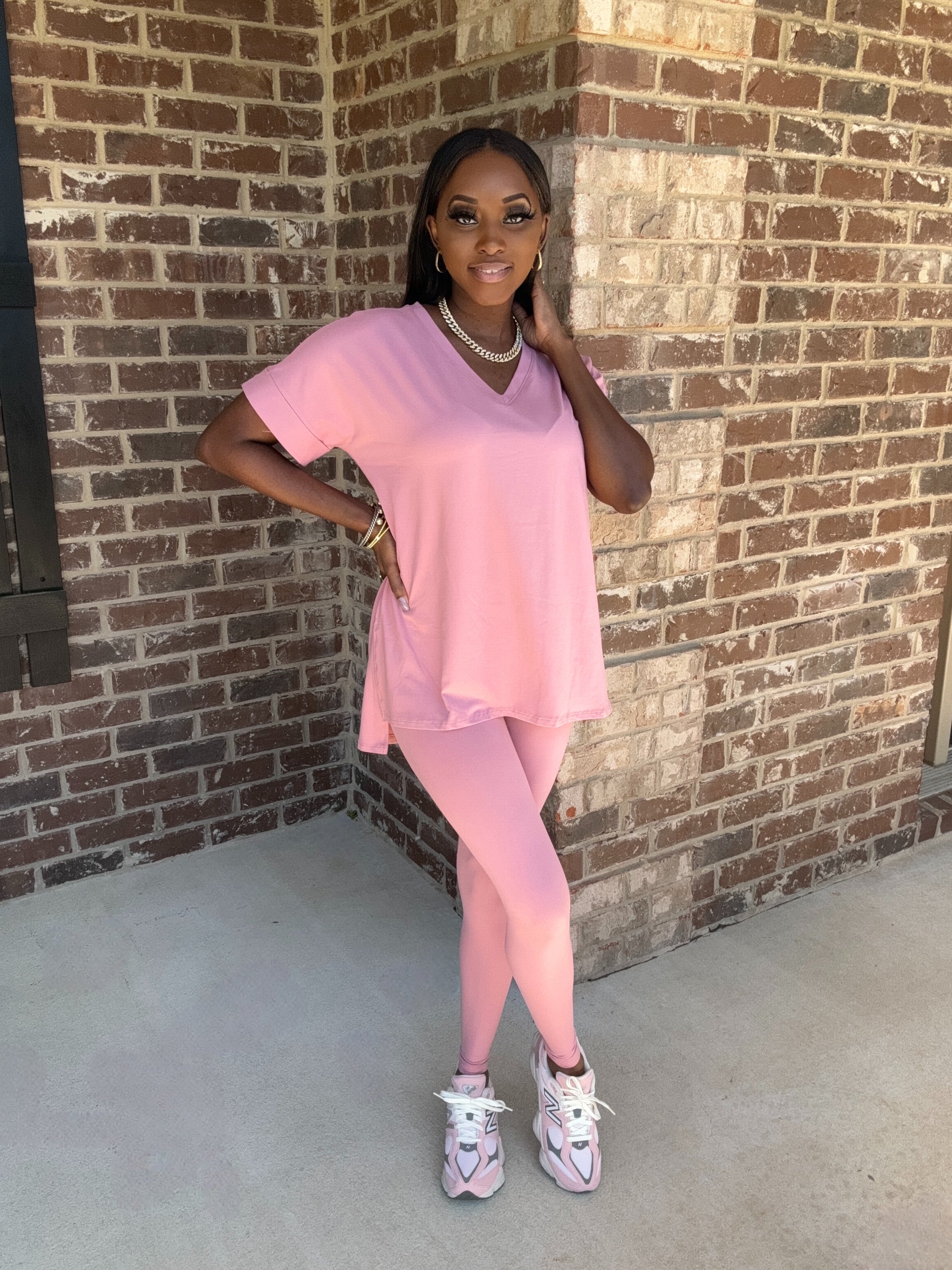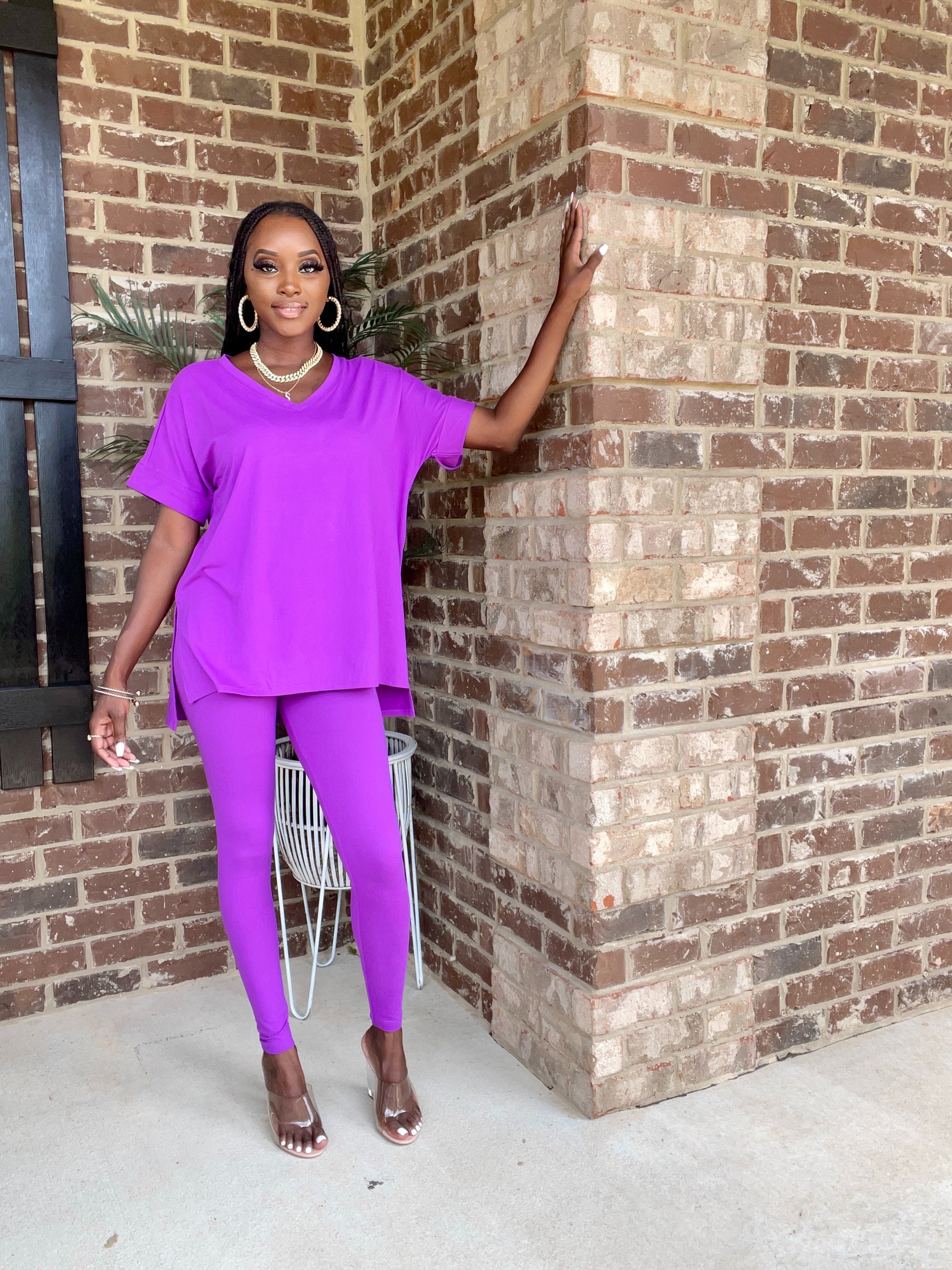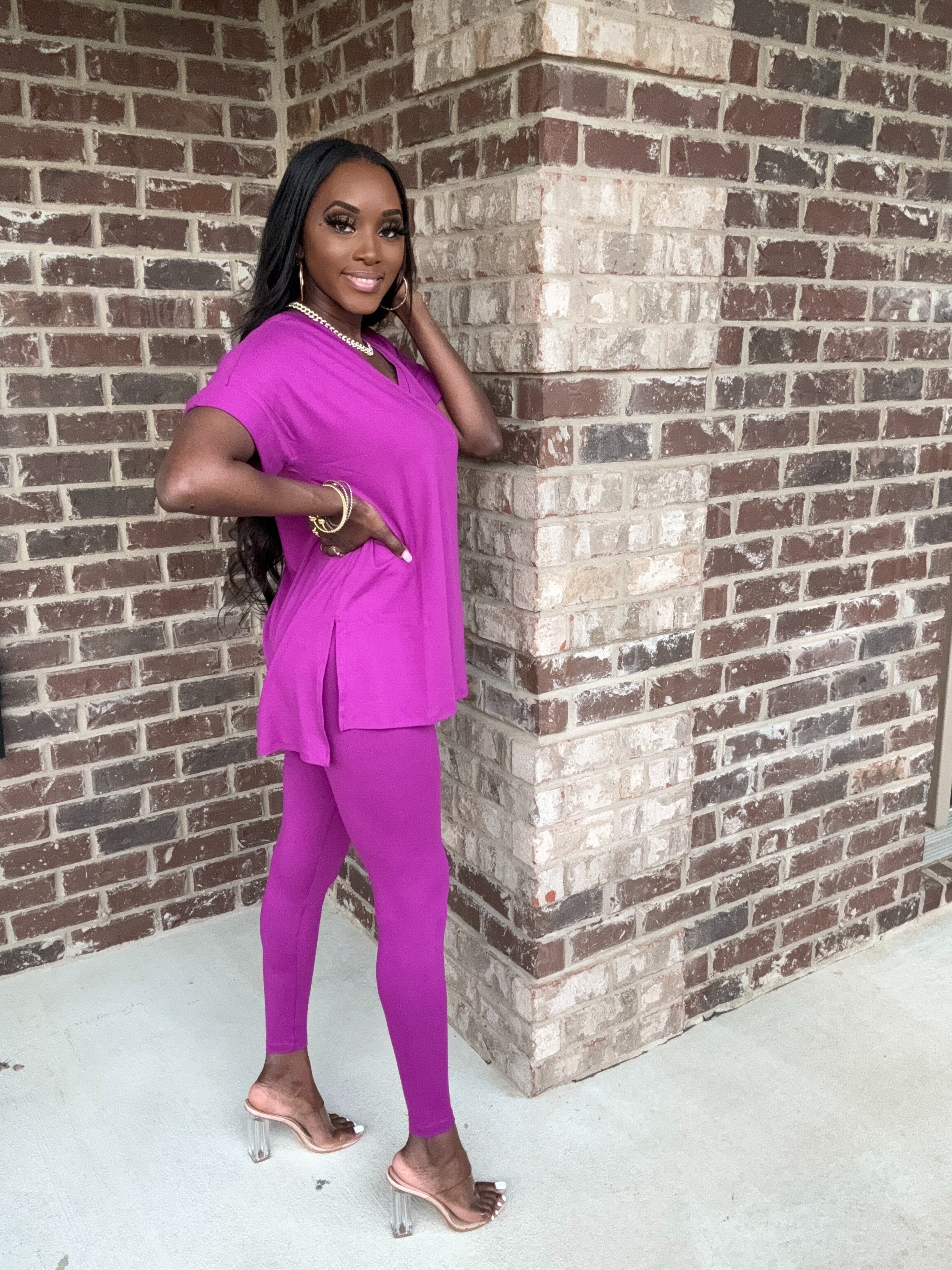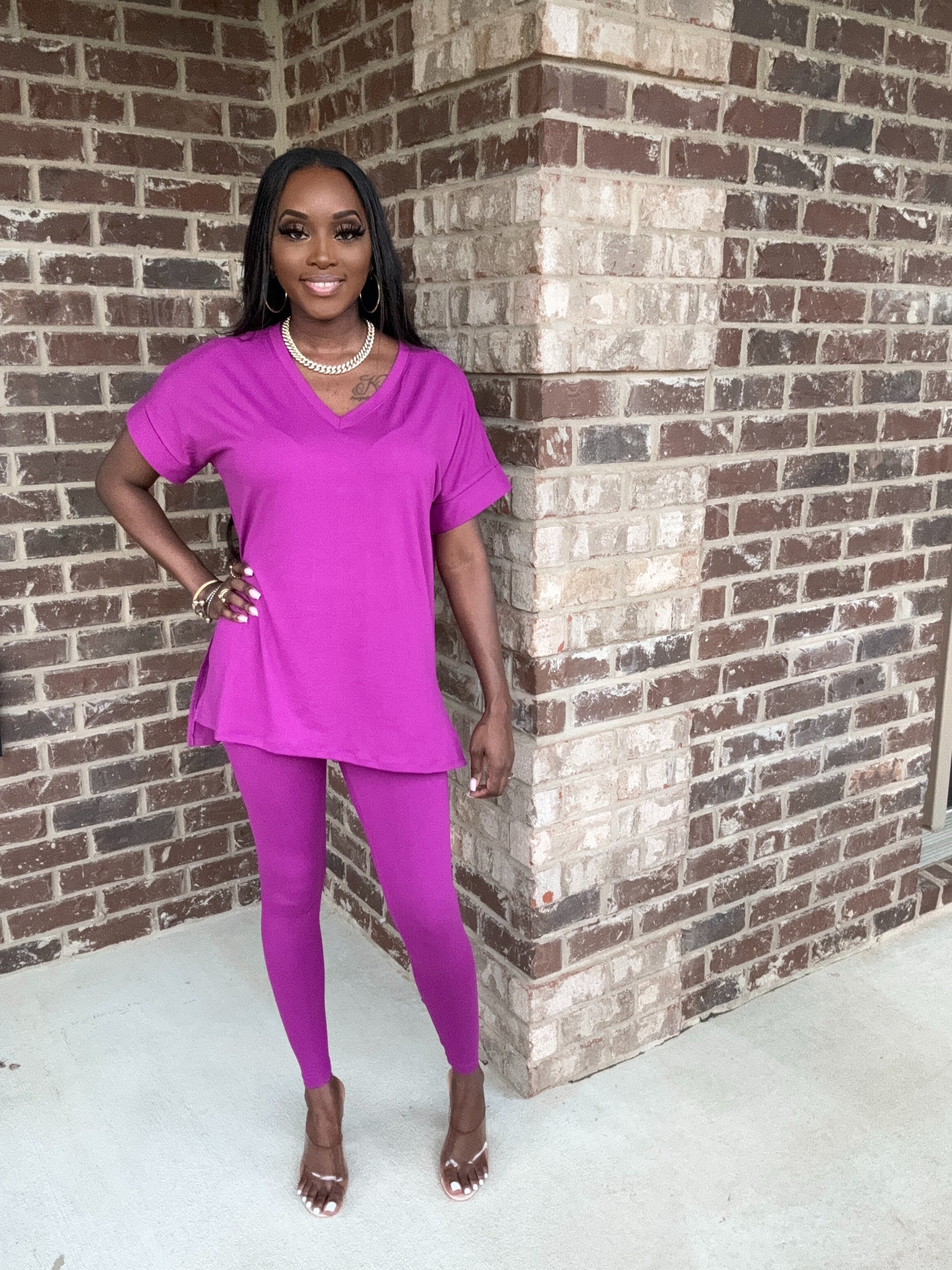 Our Butter Soft Legging Sets offer ultra-stretchy, buttery-soft fabric and perfect recovery for all-day comfort. Featuring an oversized top with a V-Neck and Hi-Low hem, as well as elastic waistband bottoms, this two-piece set is a must-have closet staple that will take you from lounging to lunch with ease.