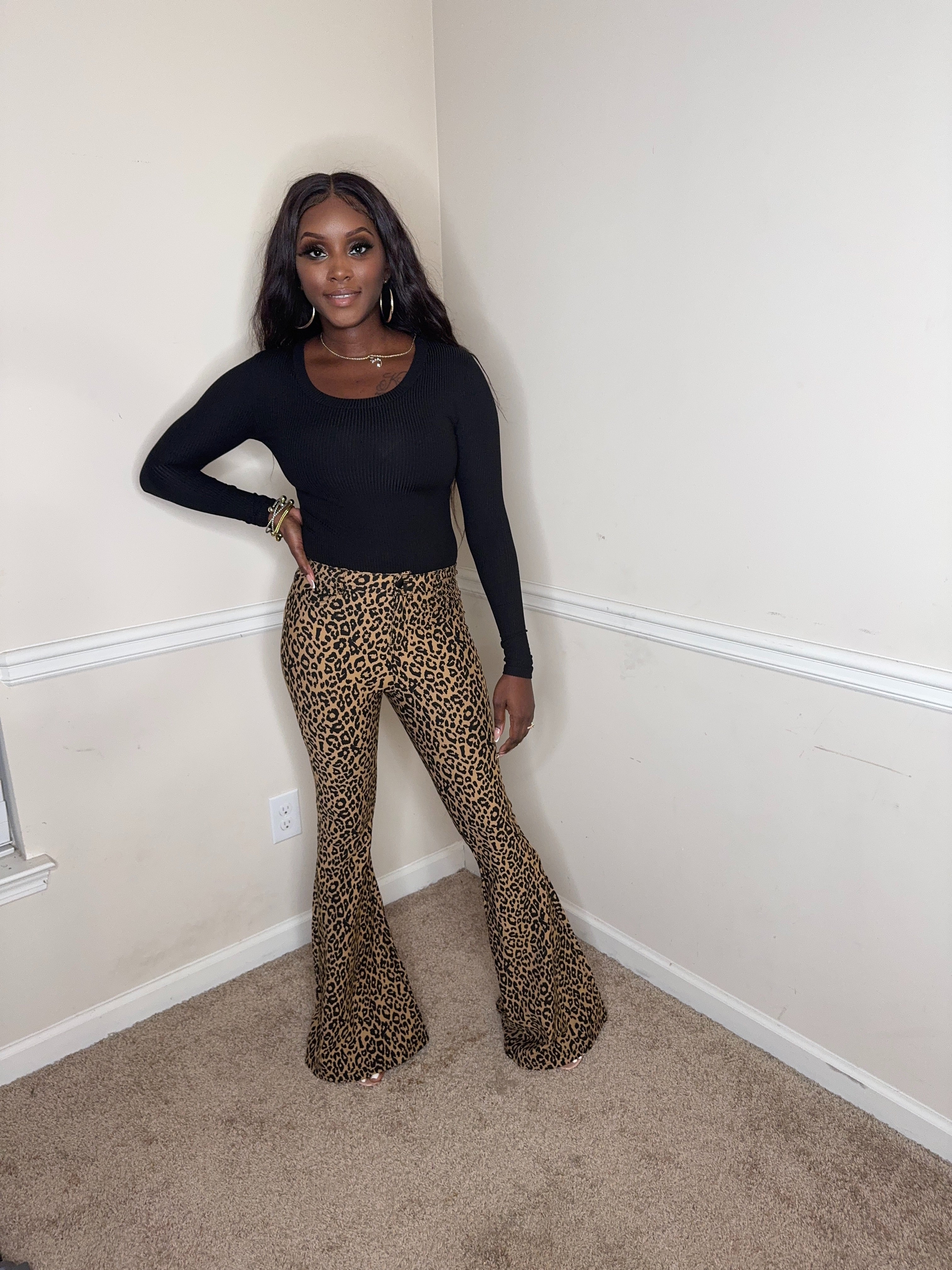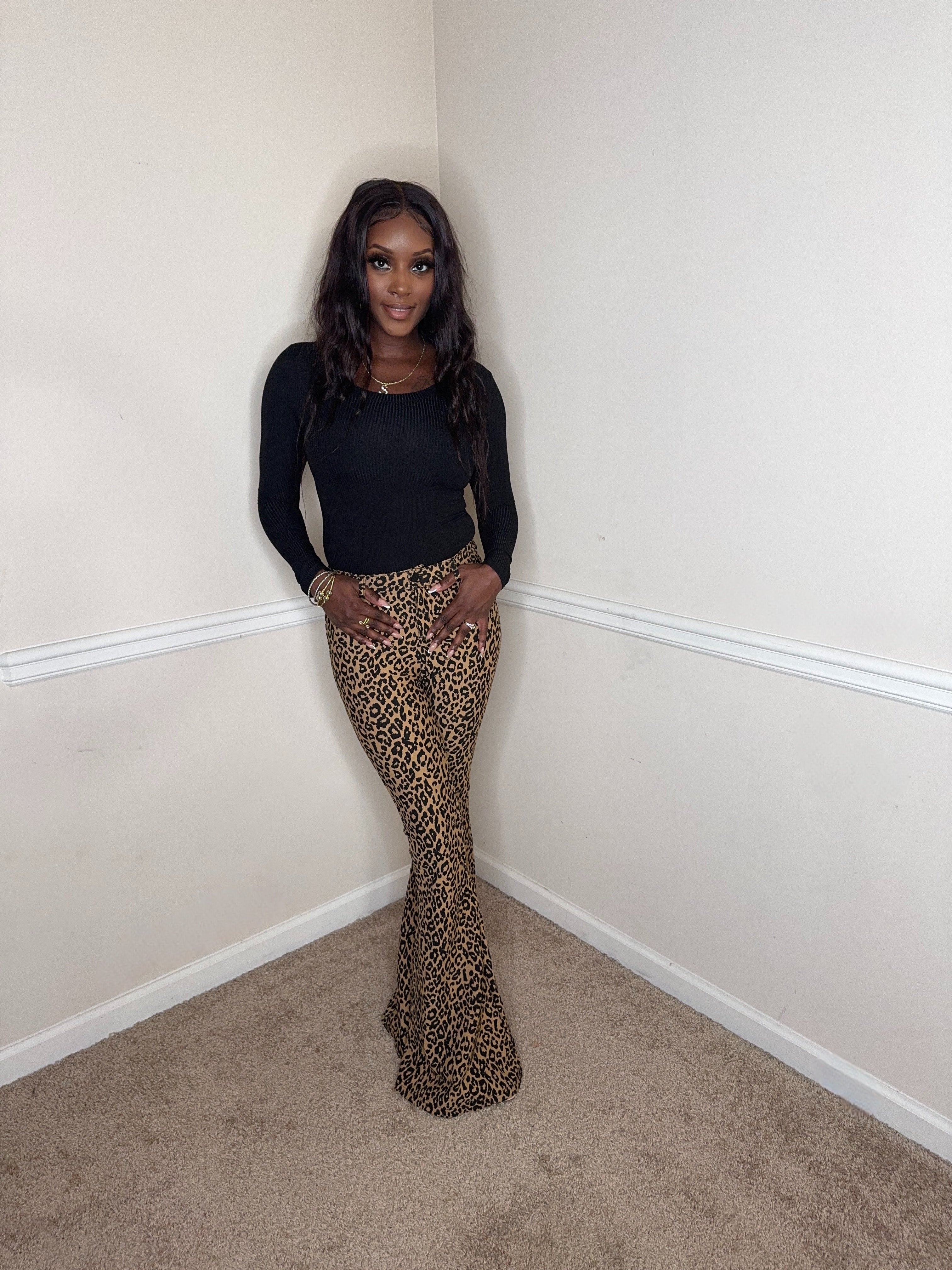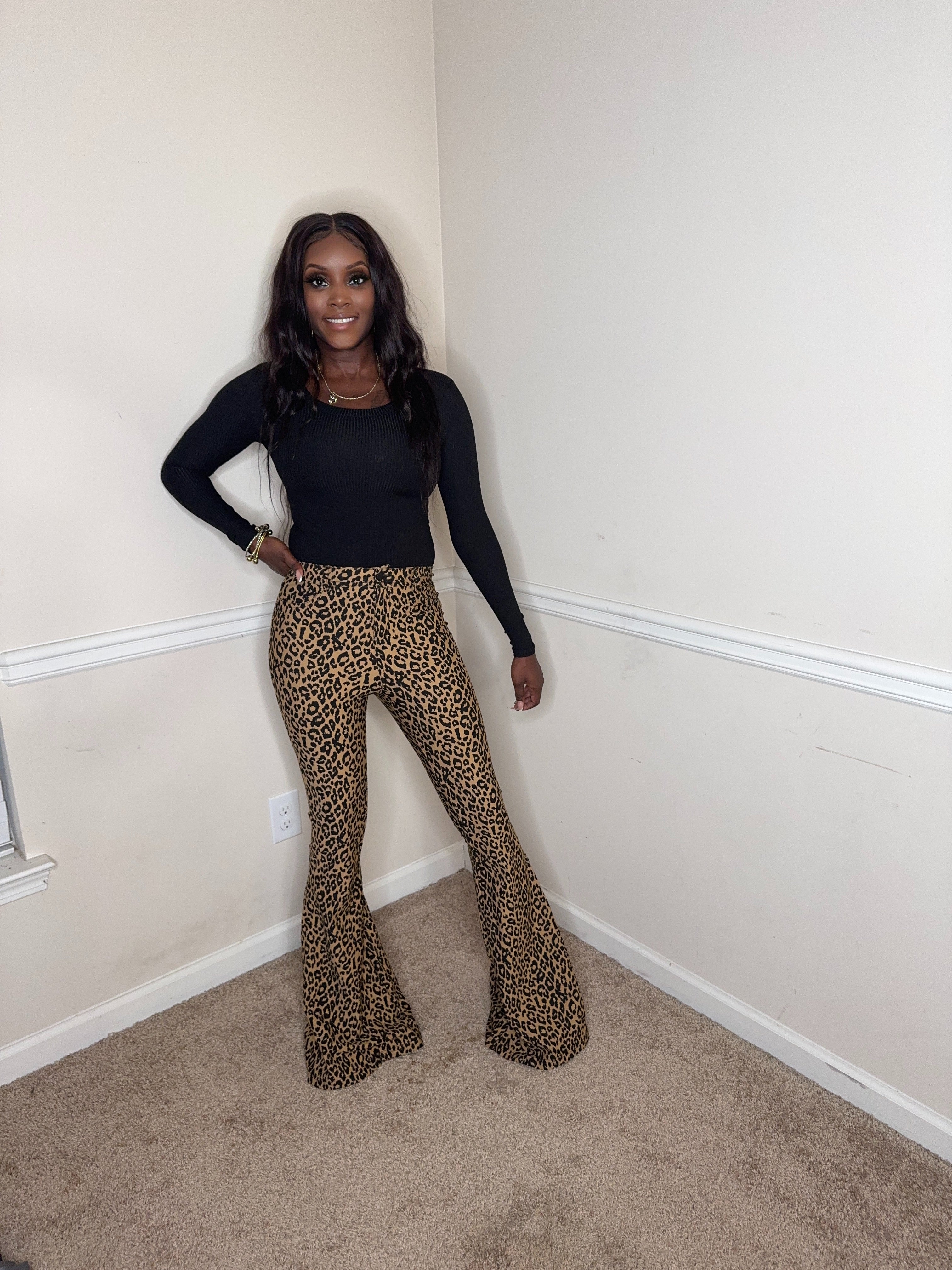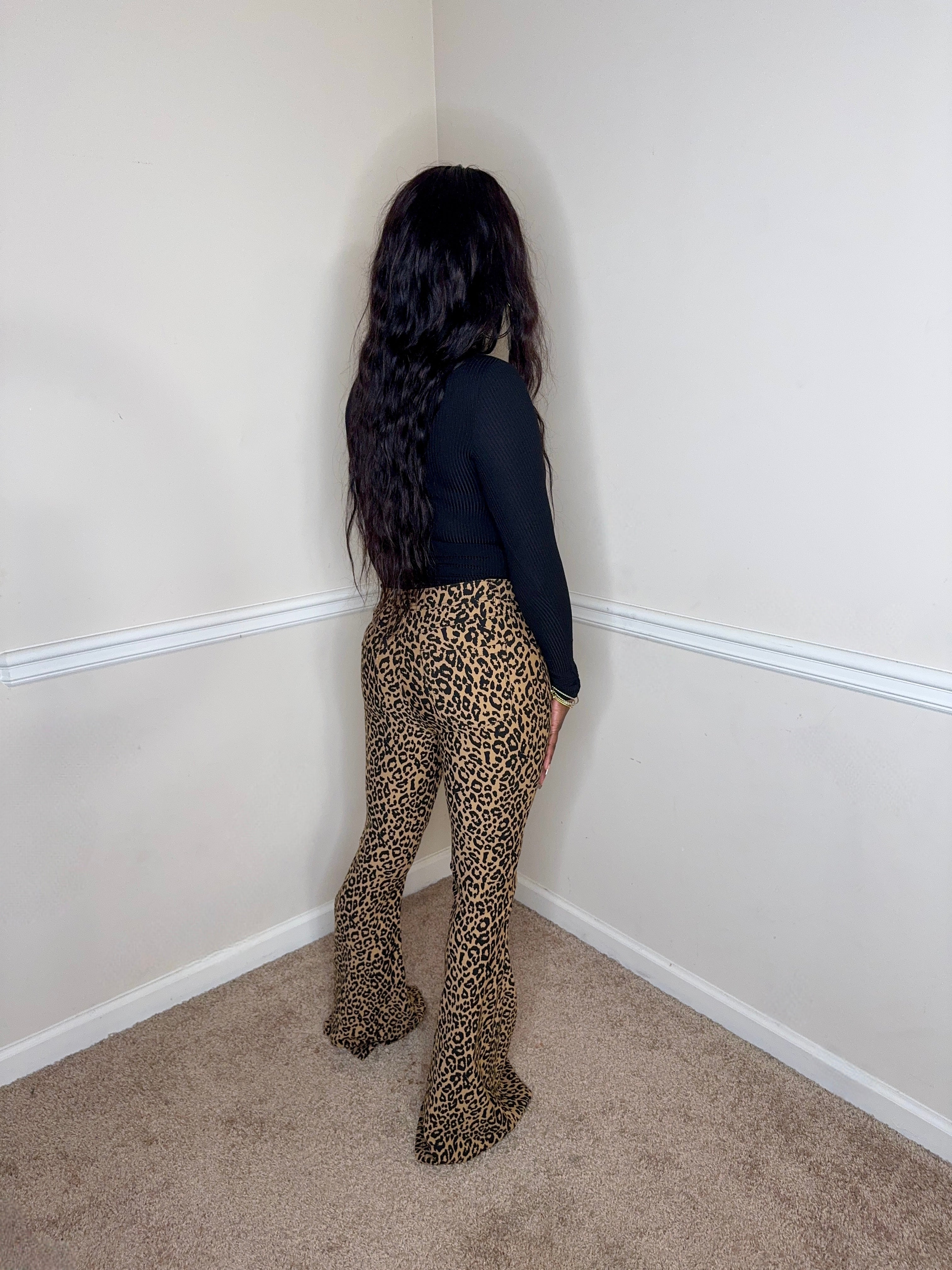 Unleash your wild side with our Fierce Leopard Print Flare Pants! Designed for the trendsetter who isn't afraid to make a statement, these high-waisted pants hug your curves in all the right places, flaring out for that dramatic, leg-lengthening effect. The bold leopard print adds a touch of untamed sophistication, making these pants perfect for a night out or elevating your everyday look. Pair them with a sleek top or cozy knit for instant chic. Own the spotlight, darling!