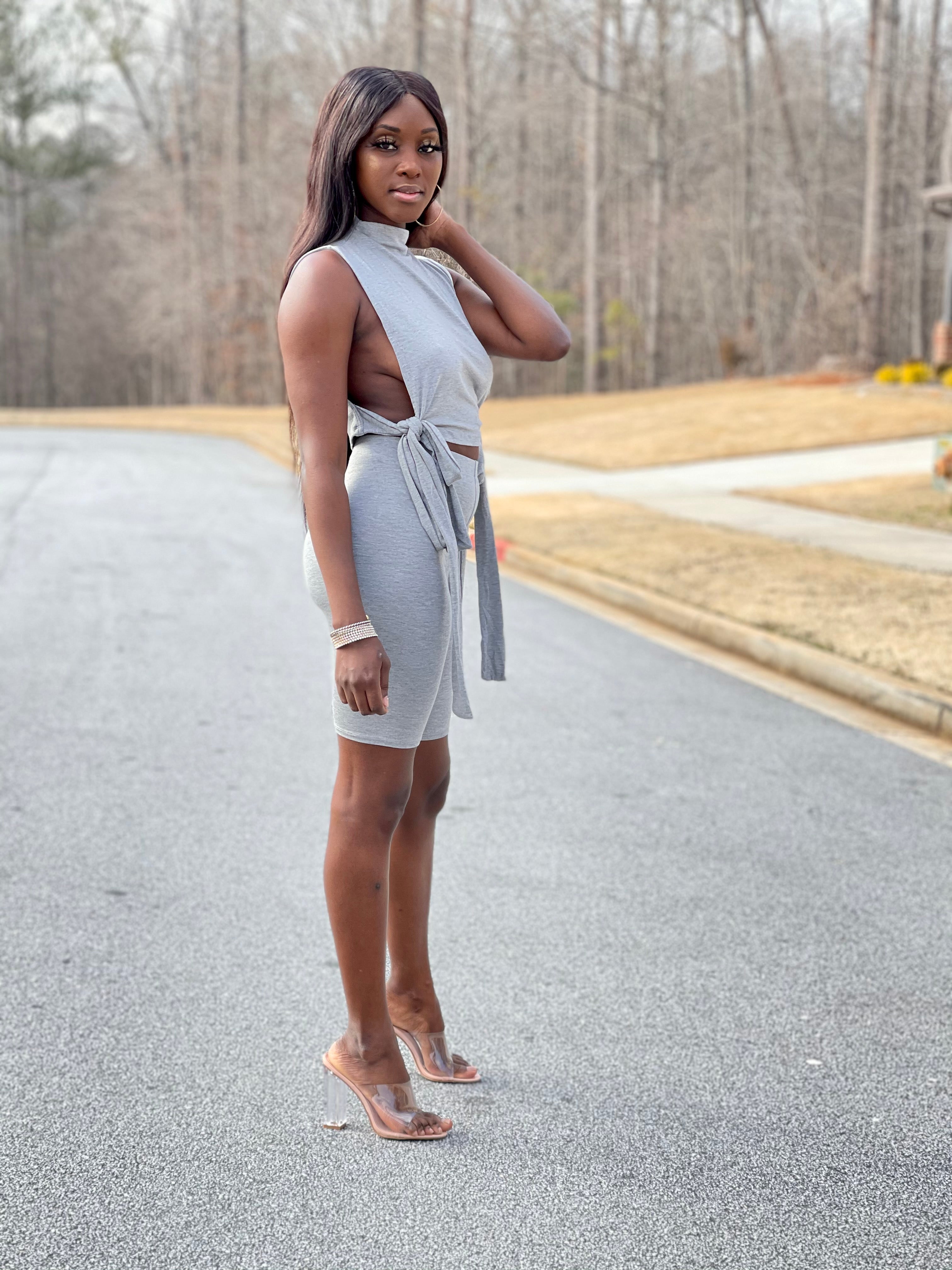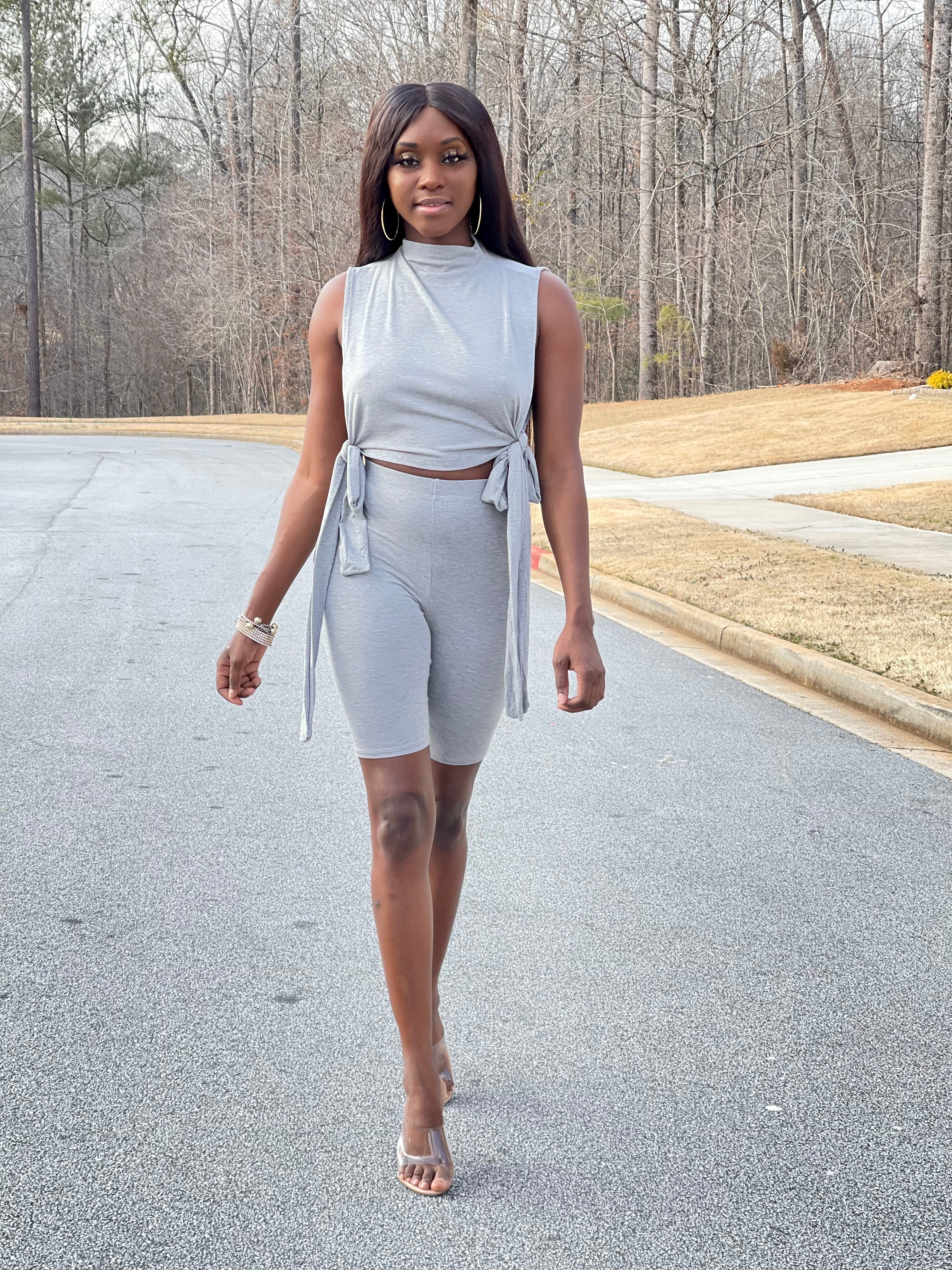 Here you go sis, your new favorite biker short set of the season! Whether you're hanging out with your friends or running errands, this set won't disappoint. It comes with a mock neck top with two side ties and matching biker shorts with an elasticated waistband. Dress it up with silver accessories to create an effortless everyday look.