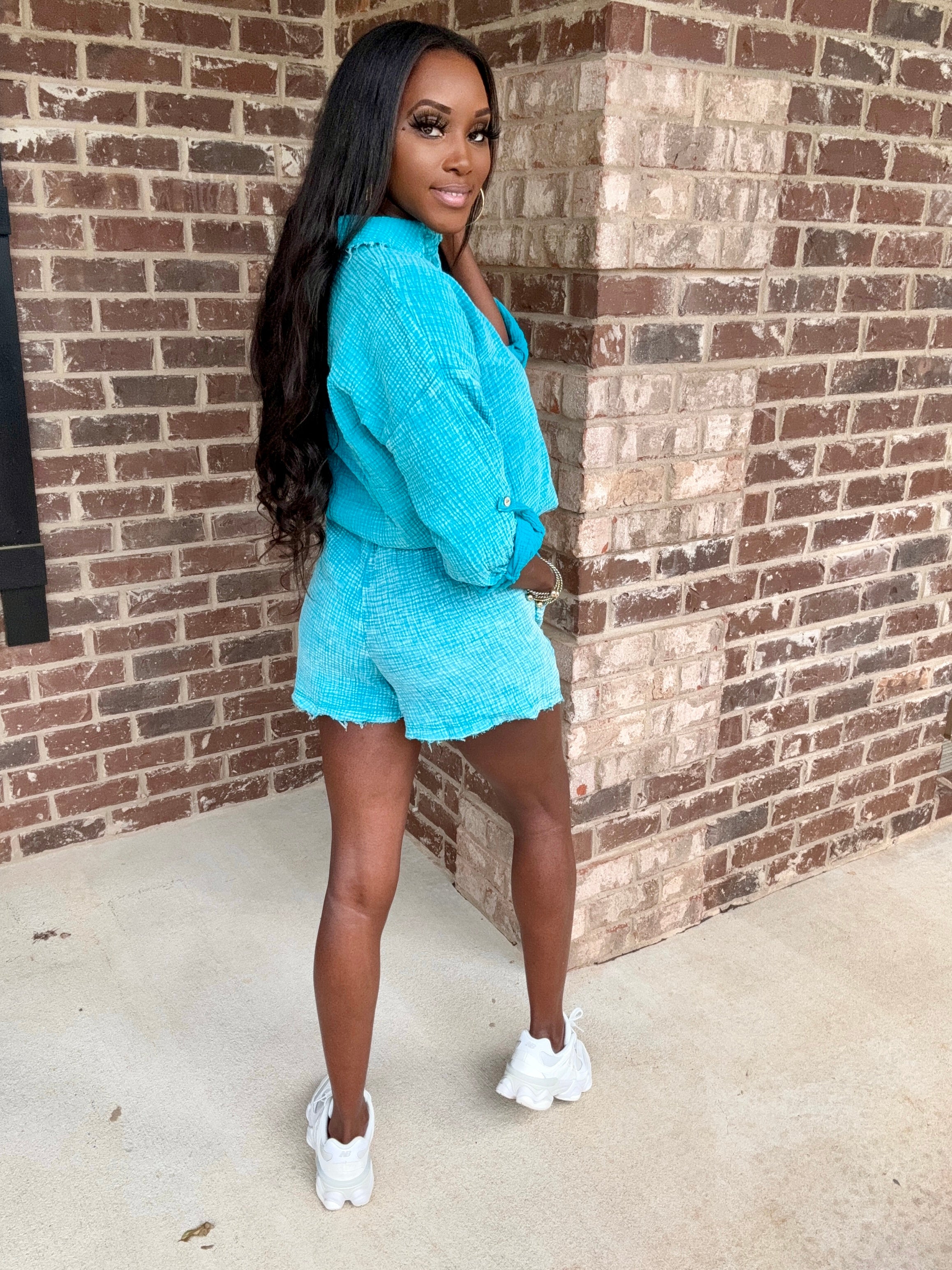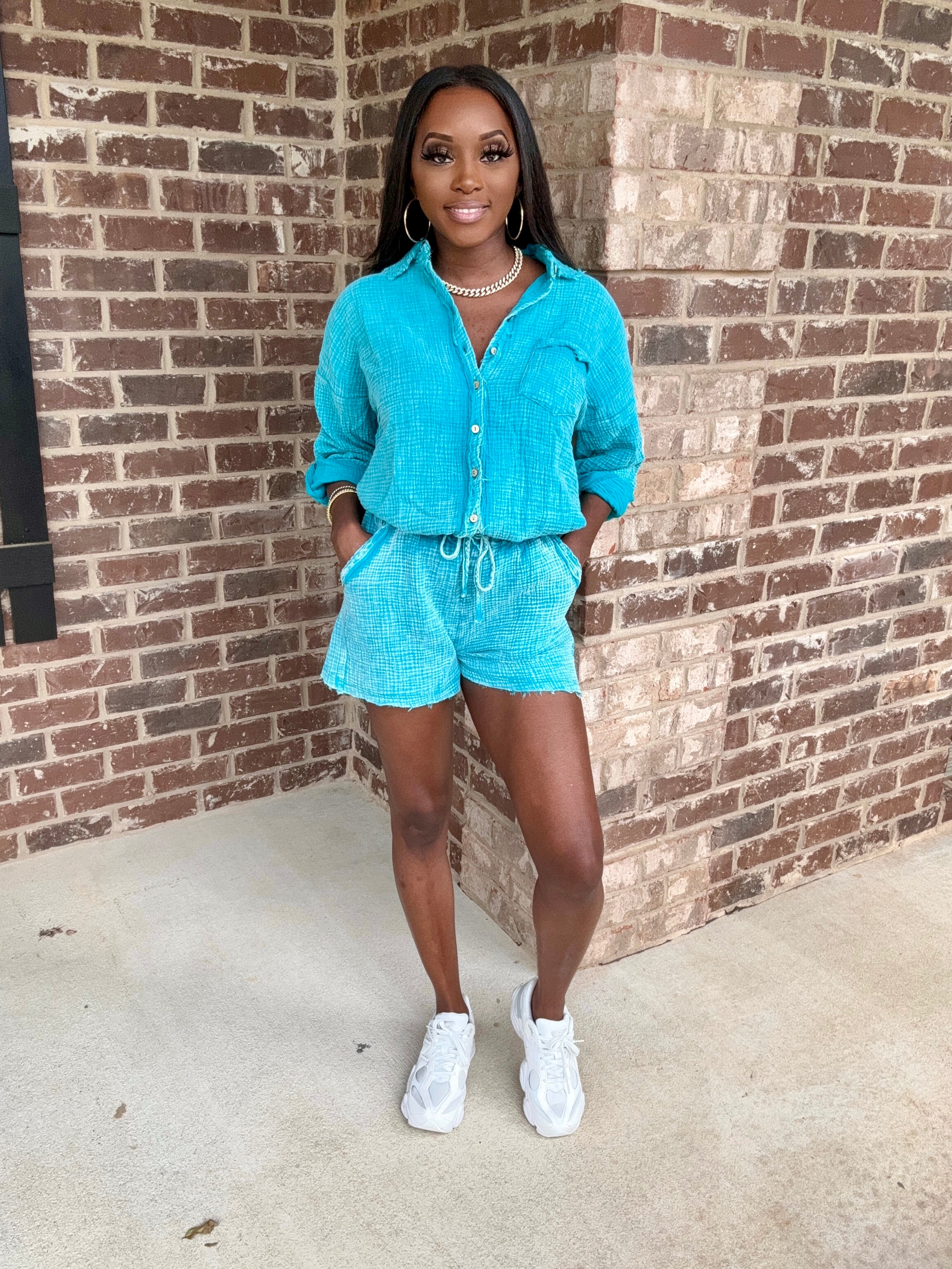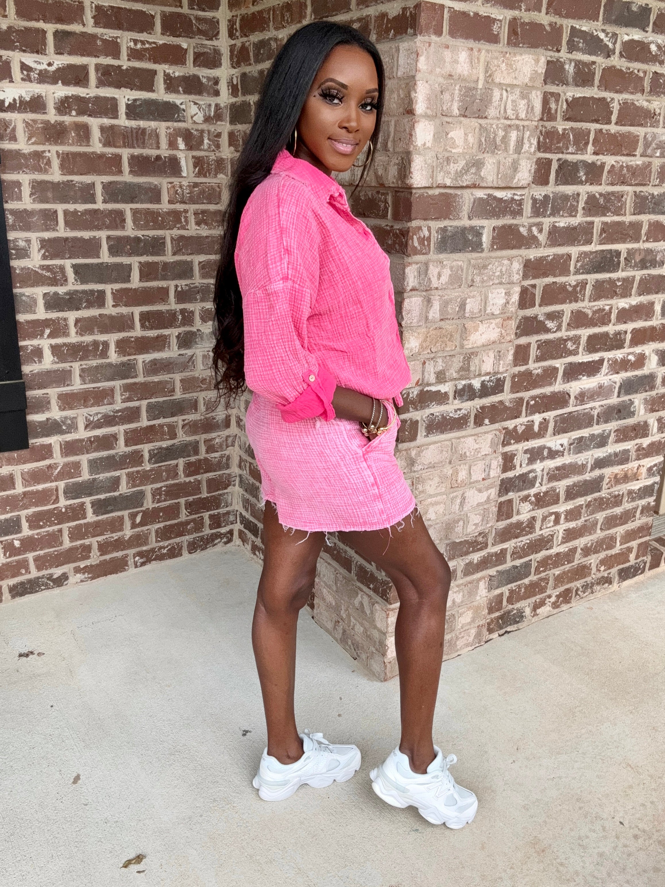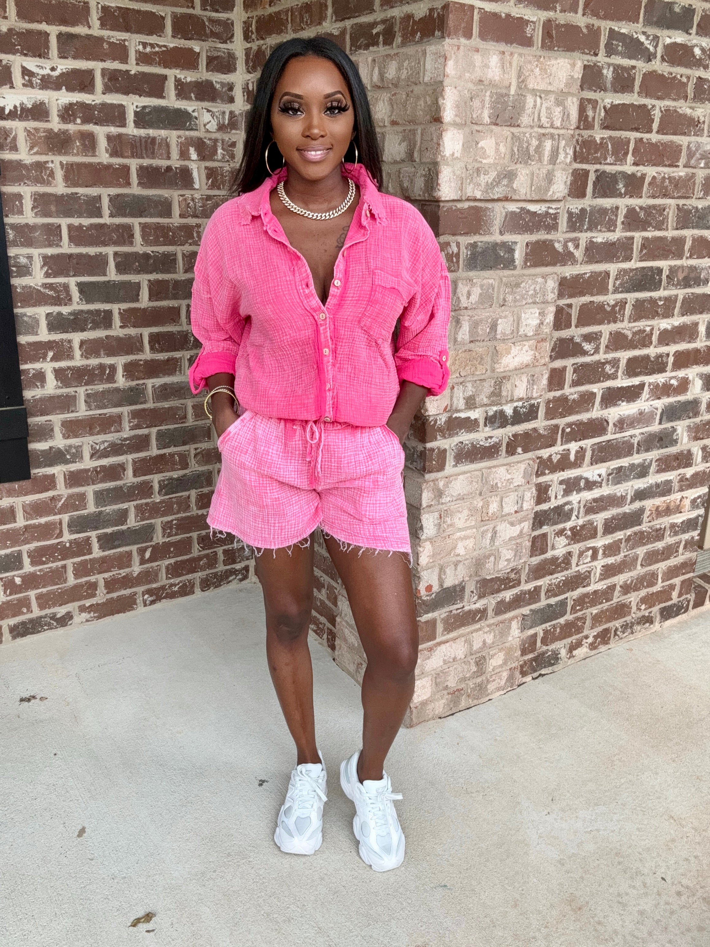 WASHED DOUBLE GAUZE FRAYED HEM DRAWSTRING SHORTS WITH POCKETS