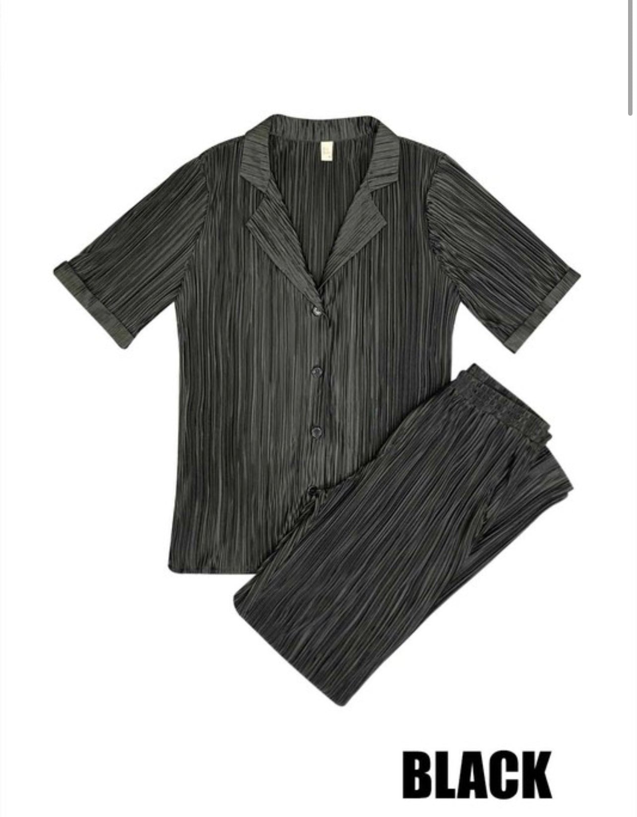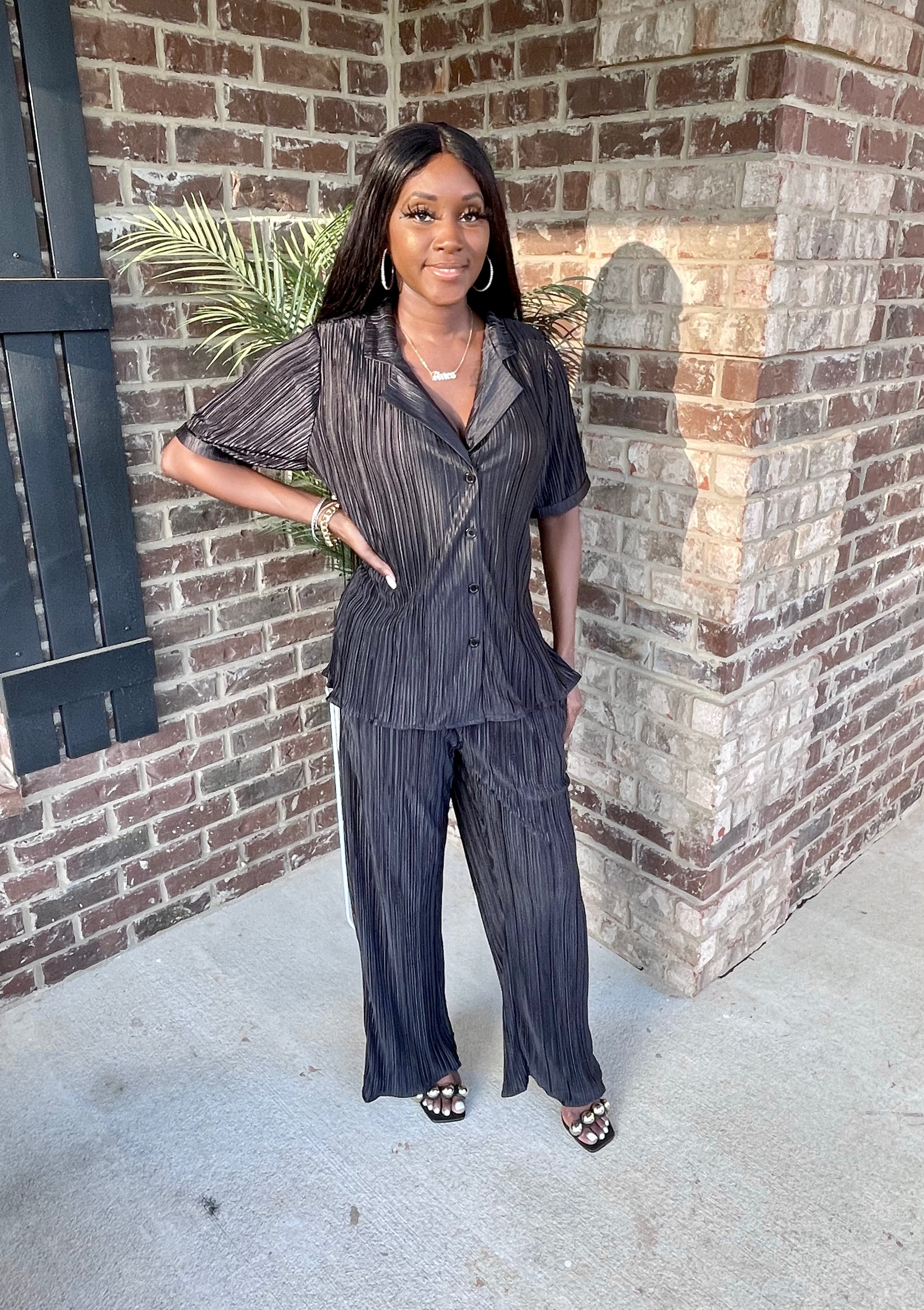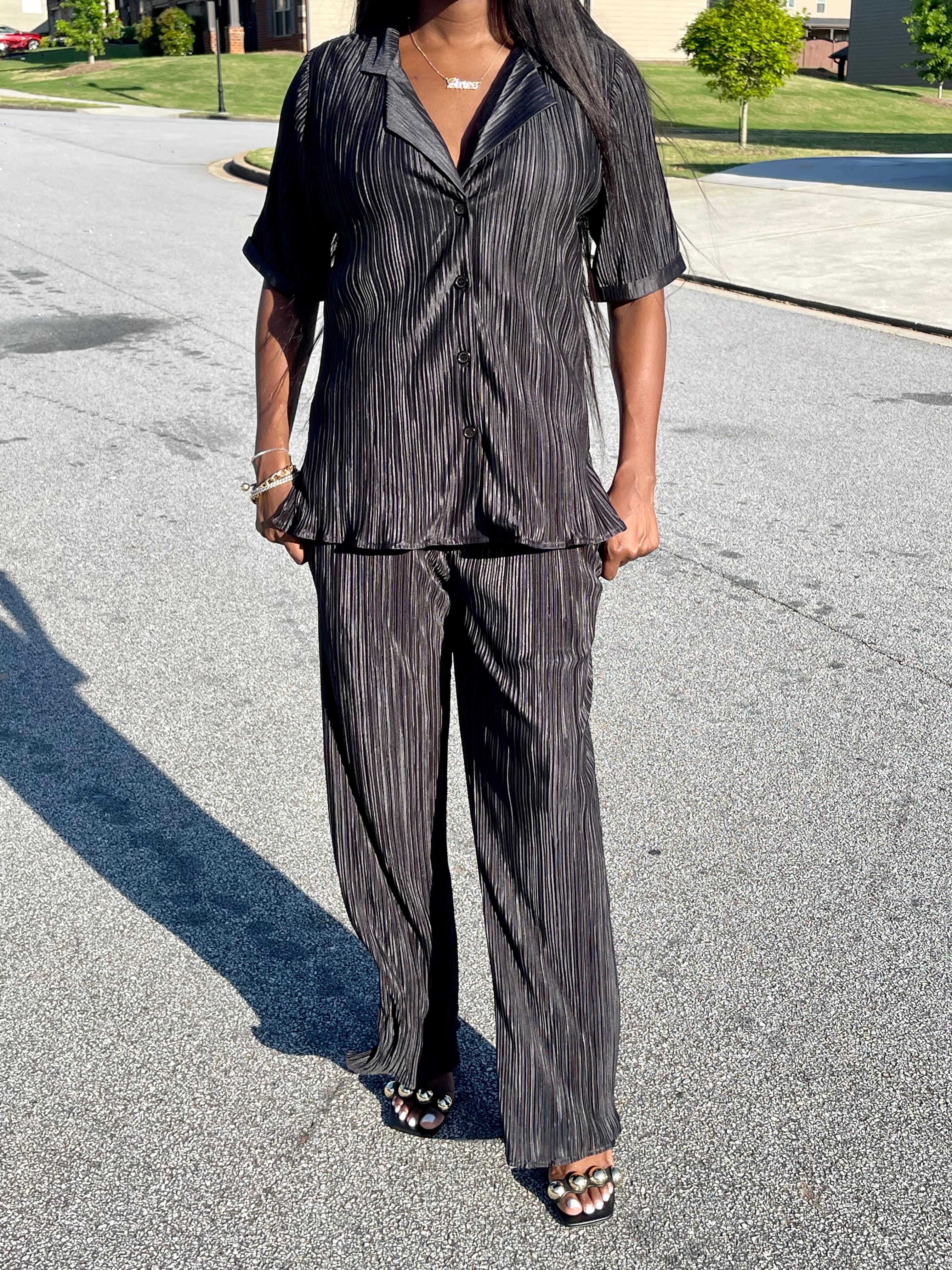 This classy pants set features woven pleated material, with wide legged pants, has pockets and flows with the wind. Perfect head turner when you enter any room.