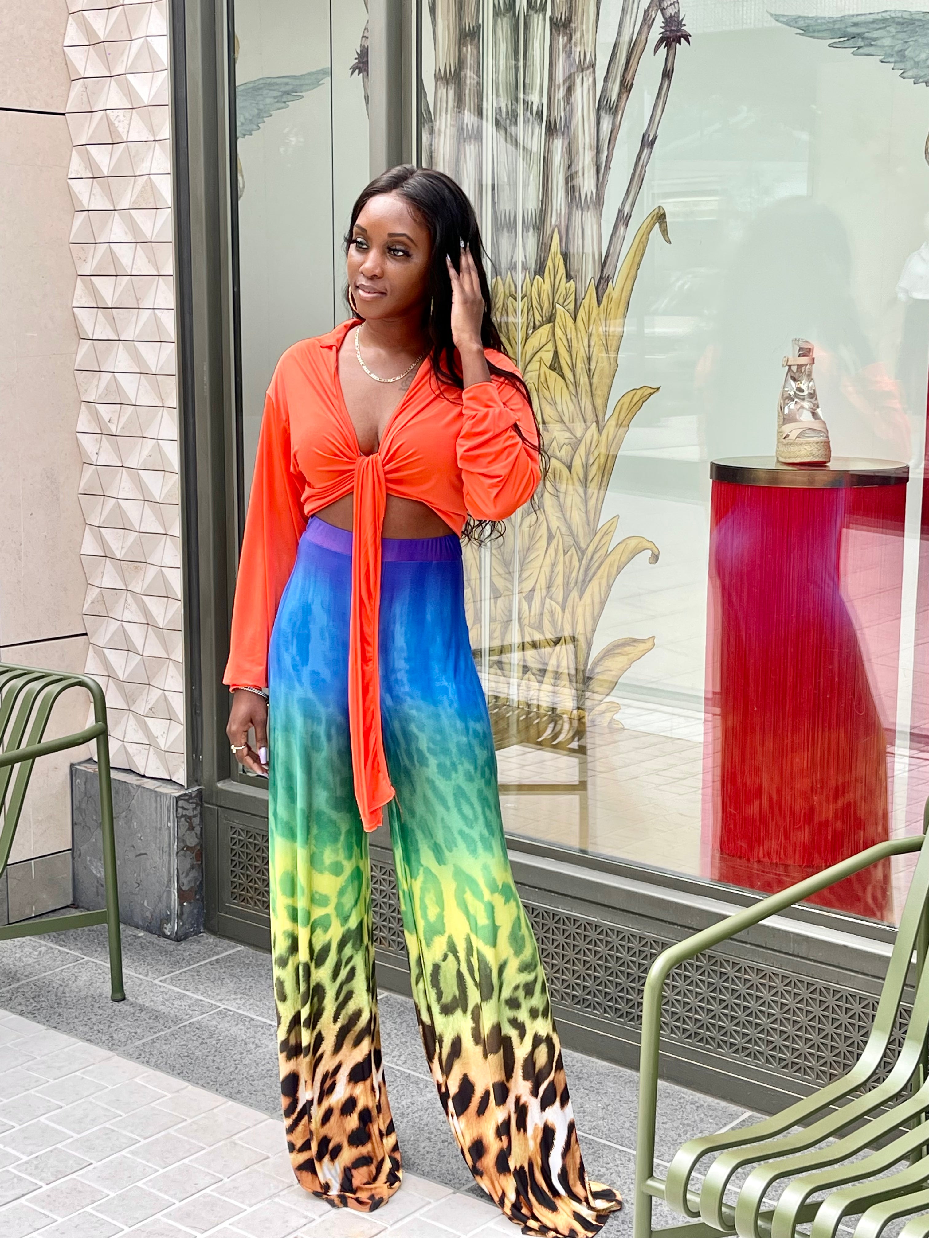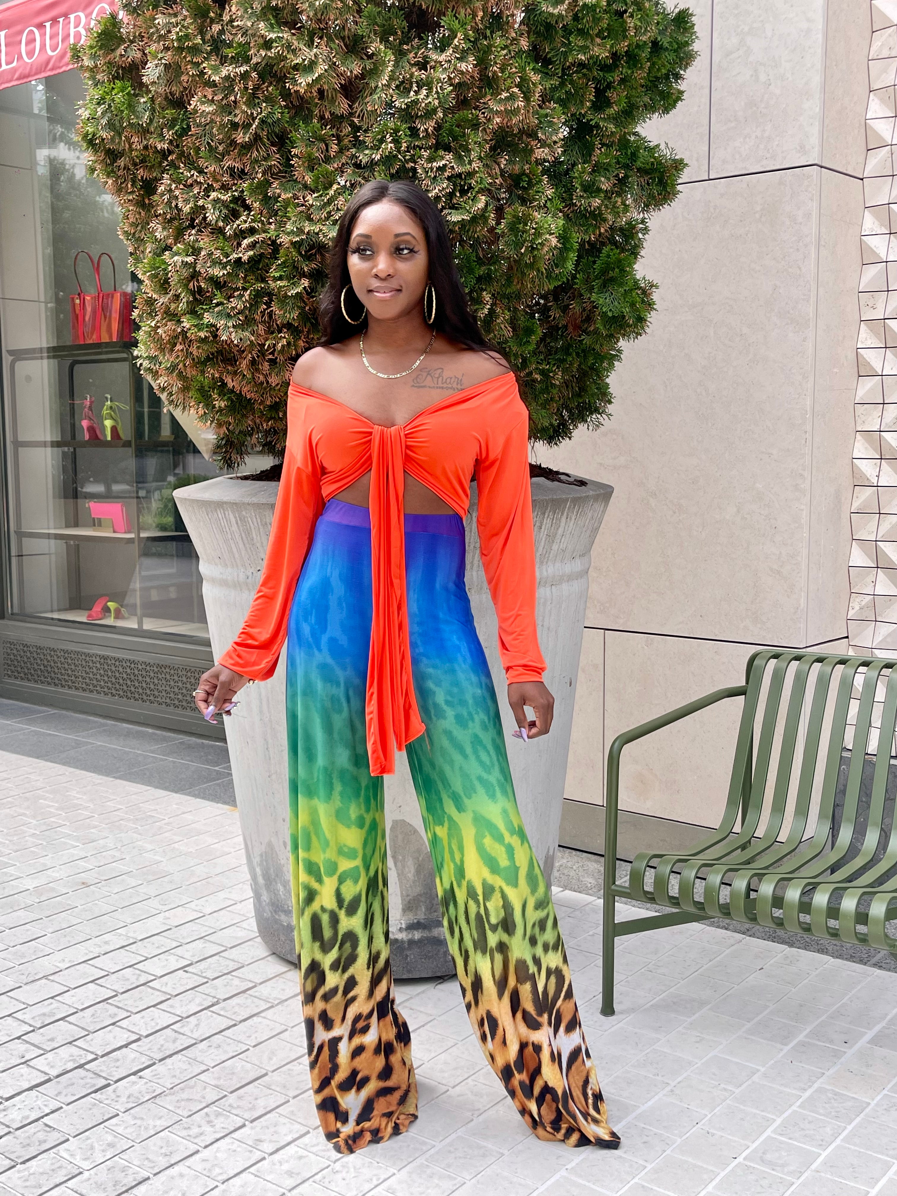 Look effortlessly in the the Wild Thang Pants Set. This two piece set features an orange crop top with a V neck and long sleeves as well as a self tie closure. The high waisted pants feature an elastic band and has wide legs for a nice flowy look.